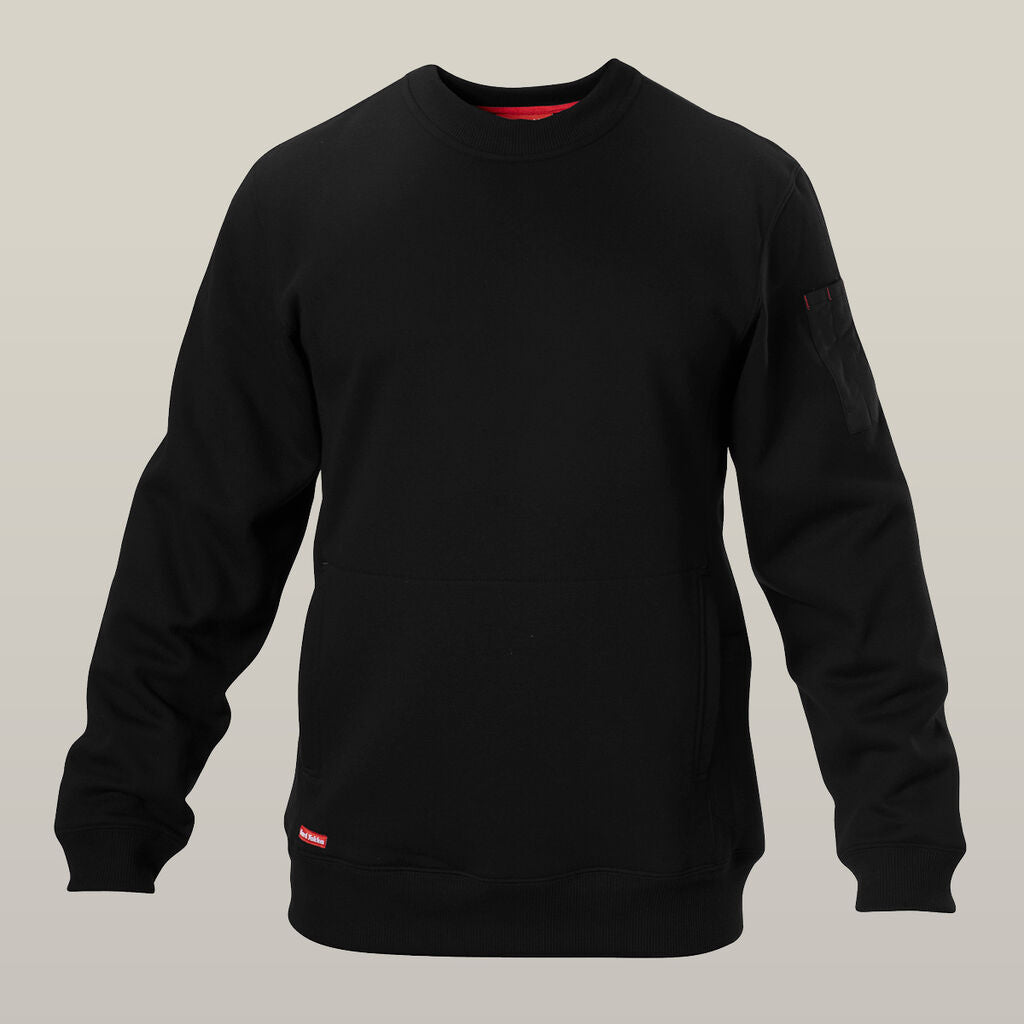 The Brushed Fleece Crew Neck Poly-Cotton Jumper is tailored for hard work with its robust design. It offers a generous kangaroo pouch pocket for easy access storage. Additionally, it's equipped with two utility pockets on the sides for extra tool carrying capacity. On the left sleeve, there's a twin pencil pocket made in a contrasting fabric, adding a touch of style and practicality.