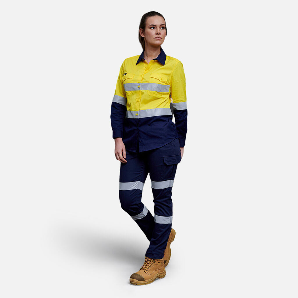 The left-hand side (LHS) features a spacious cargo pocket for your essentials, while the right-hand side (RHS) boasts a phone pocket, complete with a pen partition and a ruler pocket, keeping your tools organized and at the ready. These work pants are the perfect combination of functionality, safety, and comfort for the hardworking woman in any industry.